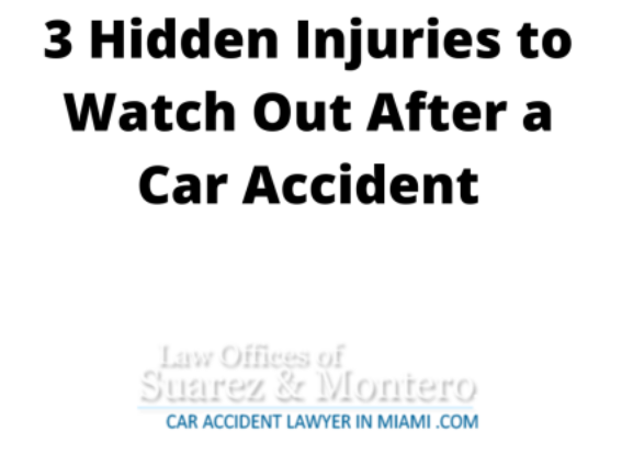 These are just a few of the more common hidden injuries. Others include herniated disks, compartment syndrome, torn rotator cuffs, a torn labrum in your shoulder or hips, shoulder sprains and strains, and brain damage.Knowing the next steps to take after you or someone you love has been involved in a traffic accident is key to protecting your legal rights and safeguarding your right to compensation. If you’re the victim of a car accident, the personal injury attorneys at Suarez & Montero can help! We understand that car accidents can have a huge impact on you and your family. At Suarez & Montero, we can help in all stages of your personal injury claim. We can help obtain evidence, document your injuries, and negotiate a settlement of your claim or case. We also make sure to keep our clients informed at all stages of their case. We believe that our clients deserve the highest level of service. Because your case is important to you, you can be assured that it will be treated with the highest level of care and attention by our attorneys and staff members. A skilled personal injury lawyer can make sure you avoid common mistakes injury victims make when negotiating a claim with an insurance company or the party responsible for the injury. If you or someone you love has been involved in an accident, contact us today for a free consultation.
