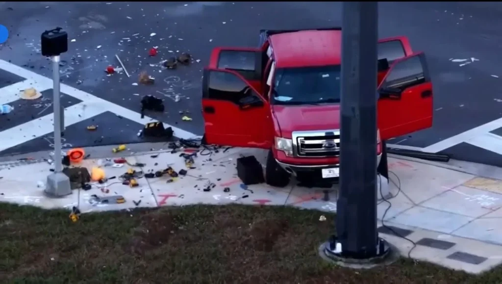 Nearby, a red pickup truck with airbags deployed is stopped partly on the sidewalk and surrounded by smashed glass and debris.