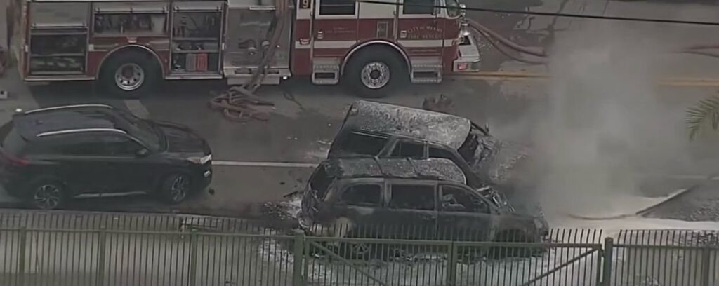 The SUVs burst into flames after the crash, causing roads in the area to shut down, Miami Police said.