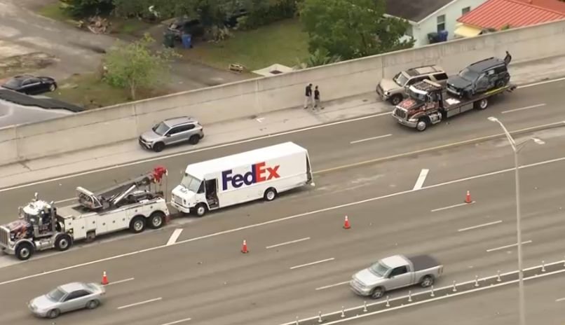 Helicopter video captured a FedEx truck at the scene of the crash, along with at least one damaged vehicle being towed away.
